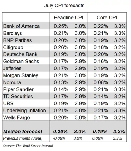 市场普遍预计本次CPI3%13个月低点)降至2.9%,从月率来看前值已经跌至疫情以来最低的-0.1%。核心CPI预计从3.3%3年低点)降至3.2%,下图是华尔街日报汇总的各大金融机构对此次整体和核心CPI的环比/同比的预测。