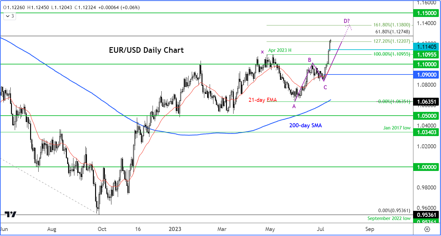 值得关注的是一个基于斐波那契数列的价格走势正在形成,即谐波蝶形——见图表上的注释。随着价格点X、A、BC已经确定,关键问题是“D”将出现在哪里。这通常是价格遇阻转跌的地方。斐波那契扩展点位可以作为参考。BC段的127.2%延伸位于1.1220。但与AB段相比,CD段的移动速度更快,我预计CD段会比AB段长。因此,继续向161.8%斐波那契延伸位1.1380是我认为欧元/美元可能形成至少是临时顶部的地方。